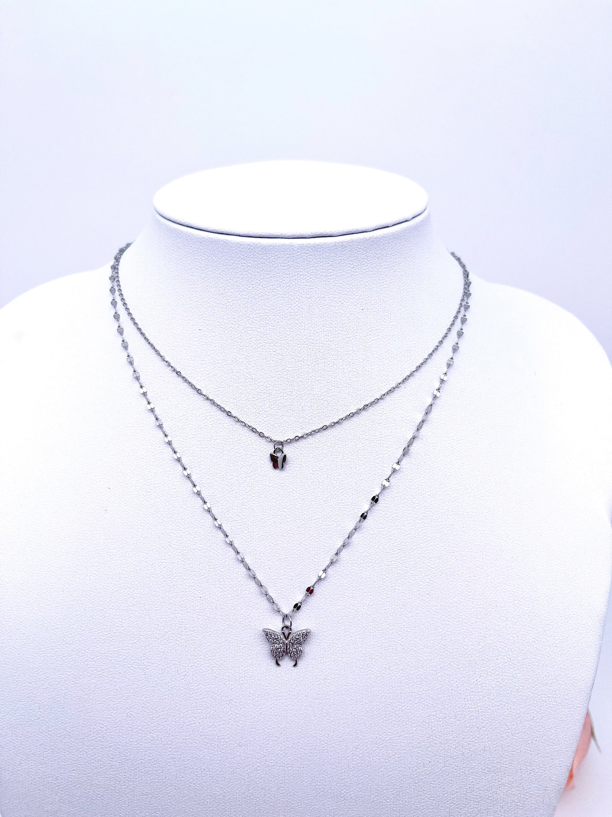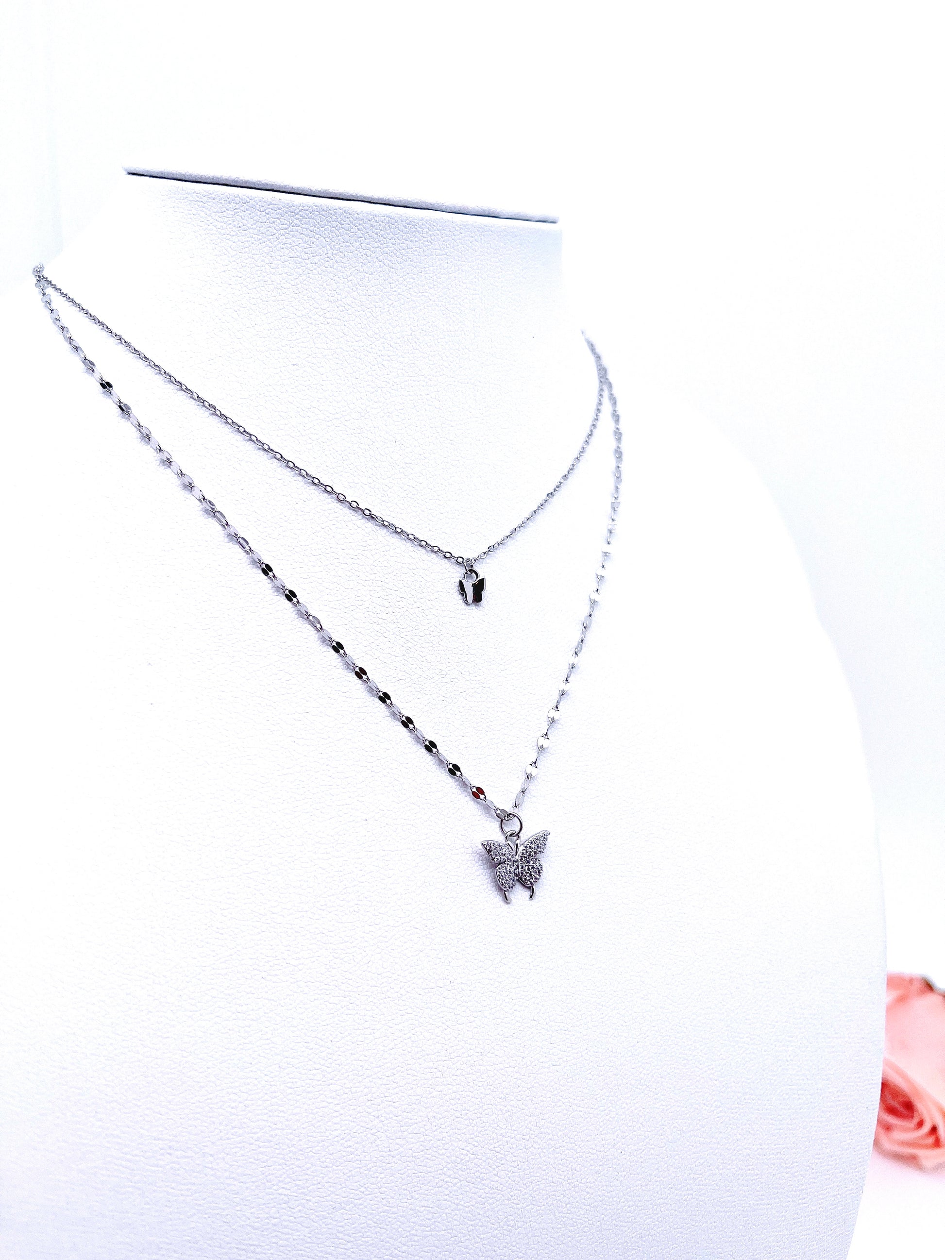 One of our popular butterflies necklaces. A nice gift for that special someone, these necklaces are crafted from rhodium plated sterling silver. High polished finish for long lasting shine that will never go dull. Simple and classic, it features two butterflies on two chains and same clasp.