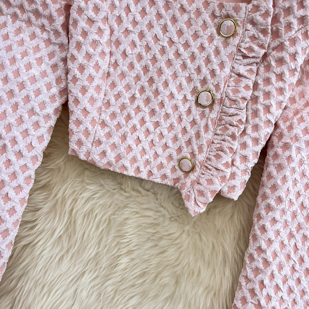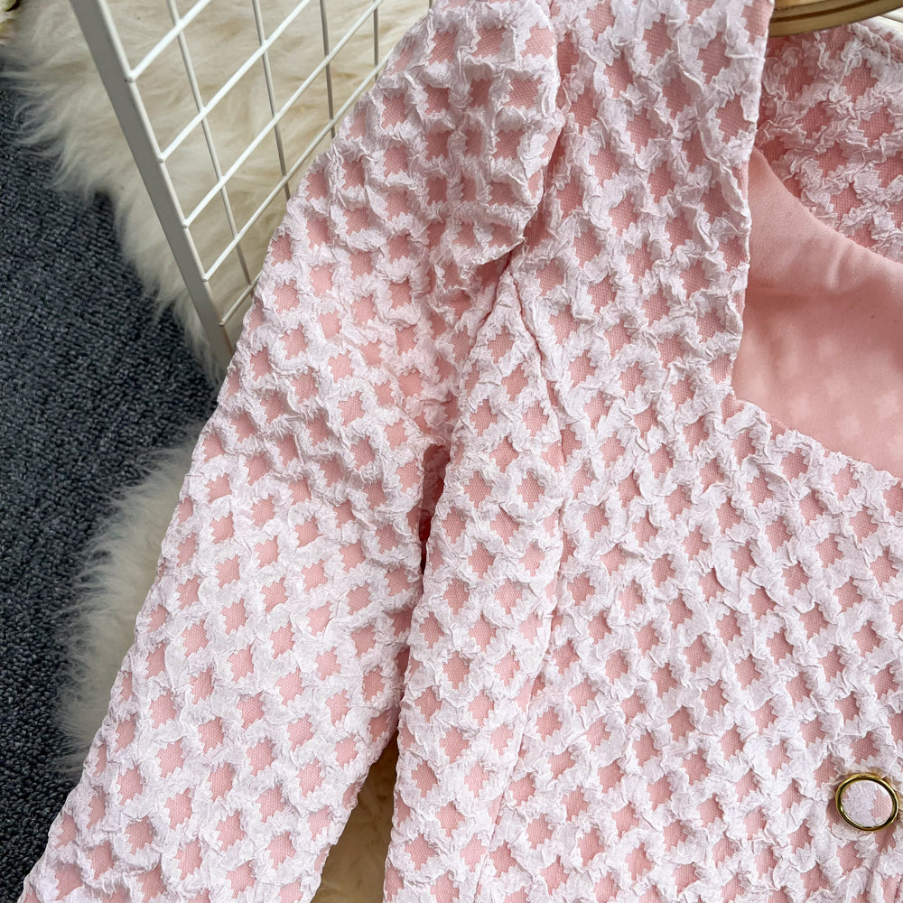 In case of getting dressed. This set is a short length skirt with French square style top detailings. It features a square neckline and elegant outlook.